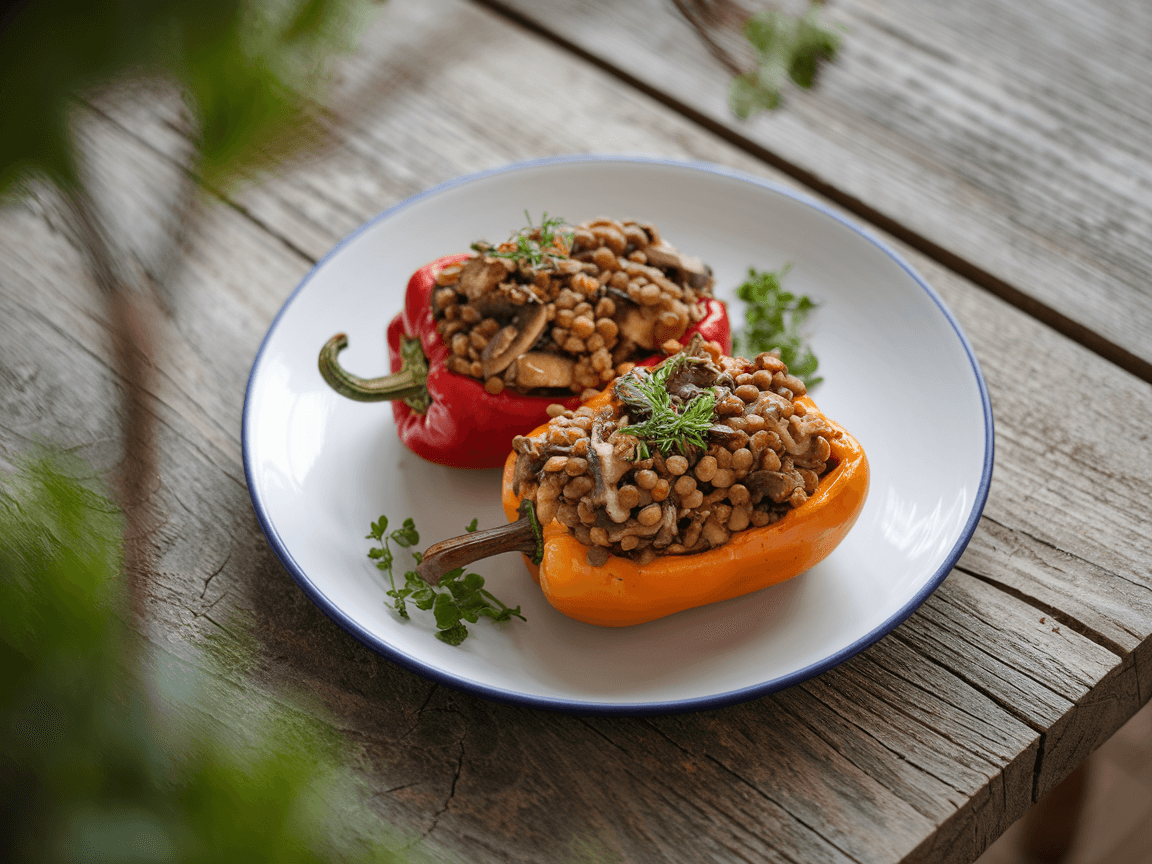 - Fill each pepper generously with the lentil and mushroom mixture, pressing down gently to pack the filling.
