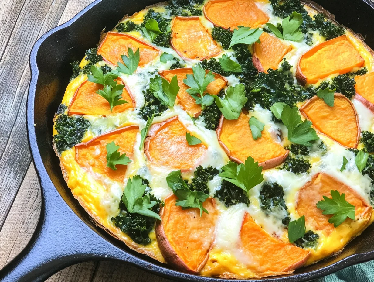The sweet potato and kale frittata is a simple, colorful, and flavorful dish that combines sweetness and nutrition for a balanced meal.