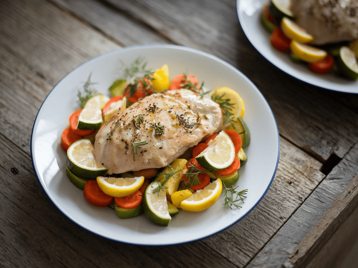 - Place the marinated chicken breasts on top of the vegetables on the baking sheet. Optionally, add lemon slices over the chicken for extra flavor.