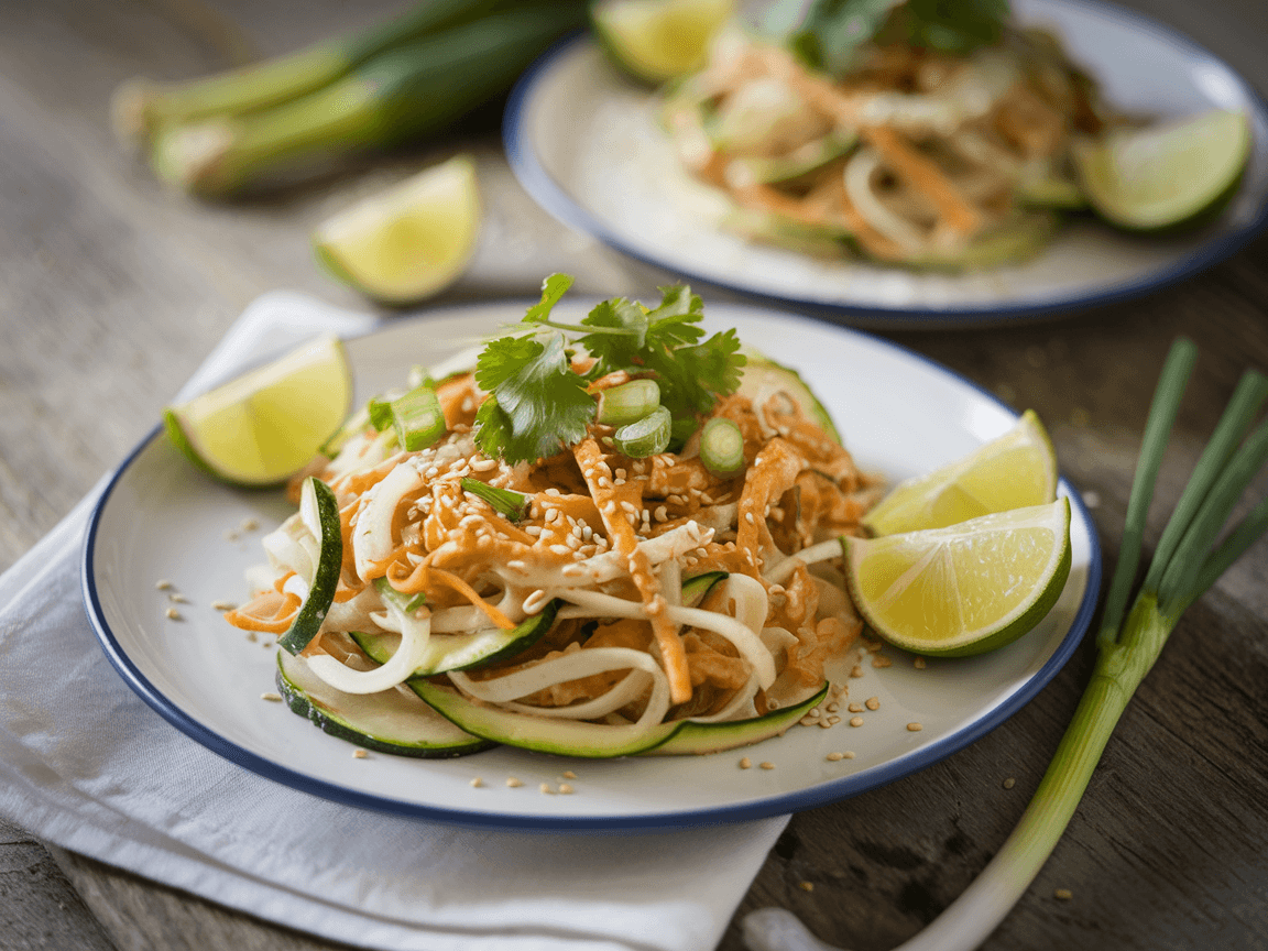 - Divide the Zucchini Noodle Pad Thai among plates and top with sliced green onions and crushed peanuts. Serve with lime wedges on the side.